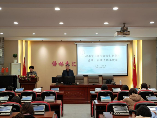3月23日晚,外国语学院在立行楼五楼报告厅举办“AI数字+时代的语言服务:变革、机遇与职业突围”专题讲座。特邀译国译民集团行业导师谢亮亮来校宣讲,学院党总支副书记李亚芳主持,英语本科2025级全体学生参加。