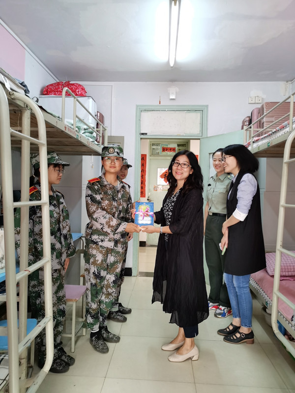 走访慰问过程中,学院领导班子对新生军训以来表现出的优异成绩和不怕吃苦、坚持训练的精神表示充分肯定,对即将到来的中秋佳节和国庆假期对同学们送上祝福,以赠送图书的方式对同学们未来四年的大学生活寄语了美好的希望。他们与2020级新生展开了亲切的交流,询问了同学们的基本信息,耐心解答新生们的问题,帮助解决在目前遇到的一些困难。党总支书记尚瑜强调要把军训期间养成的良好作风保持下去,以5+1S宿舍管理模式要求今后的宿舍卫生,时刻注意个人防护,保持健康的生活习惯,养成健康文明、积极向上的生活习惯和干净舒适的生活环境。院长薛英利向同学们详细分析介绍了近两年学院的就业情况和学科建设情况,勉励同学们要尽快确定职业发展方向,树立理性的就业观念,珍惜时间,提前规划。薛婷副院长向新生们介绍本次捐赠图书均属高等学校英语专业经典必读丛书,体裁涵盖小说、诗歌、散文、戏剧,按难易程度分为4个级别,图书对应蓝、绿、橙、紫四种封面色。并指出书香九月•喜迎新生活动”旨在以图书阅读活动为载体,引领新生开启丰富多彩的大学生活;激励英语专业新生将经典阅读变成一种学习常态、切实提高自身的英语能力与人文素养。