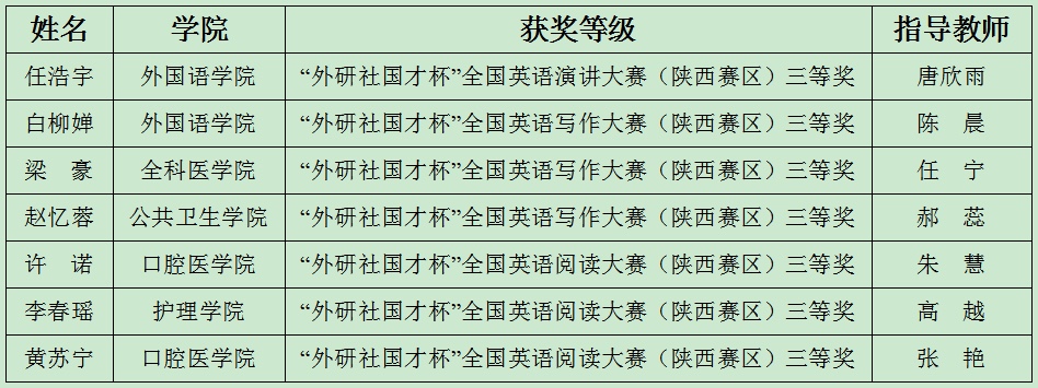 今日云景好,水绿秋山明。10月31日,2020年“外研社·国才杯”大学生英语挑战赛(Uchallenge)陕西赛区决赛在西安建筑科技大学雁塔校区举行。经过激烈竞技角逐,全省遴选出的300余选手分别在演讲、写作、阅读三大舞台上彰青春之活力,显语言之魅力。西安医学院推选的7名学子在此次赛事中表现突出并喜获佳绩。
