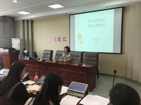 10月24日下午,学工部部长靳红樱在外国语学院报告厅为全体教工党员上了《学习党的历史不改入党初心》为主题的党课。