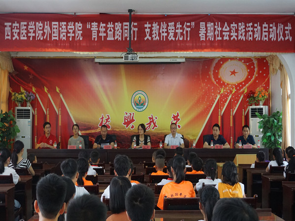 2018年7月13日,西安医学院外国语学院“支紫花开”暑期社会实践活动启动仪式在紫阳县高桥镇初级中学礼堂顺利举行。启动仪式由紫阳团县委书记方世繁主持,高桥镇镇长曾健、西安医学院外国语学院党总支副书记尚瑜、学生科科长周豪、团总支书记张皖豫、高桥镇留守儿童及学生家长代表、社会实践志愿者共同参加了启动仪式。
