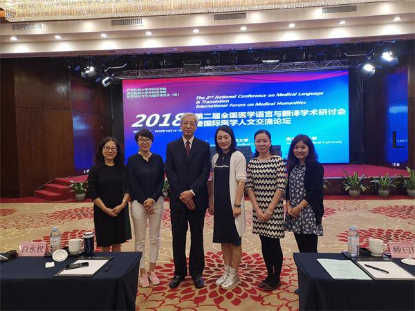 2018年10月14日至15日,我校第三批校级重点学科(医学英语)、校级重点扶植学科(医学人文英语)学科骨干一行5人参加第二届全国医学语言与翻译学术研讨会暨国际医学人文交流论坛。此次学术会议由广西医科大学承办,大会主旨发言专家均来自国内知名院所,分别是西安安交通大学白永权教授(教育部医护英语水平考试专家组组长、中华医学会全国医学外语学组主任委员)、清华大学崔刚教授(清华大学语言与心理研究中心主任、博士生导师)、顾曰国教授(中国社会科学院语言研究所、博士生导师)、李俊博士(北京大学医学部应用语言系、医学社会学博士、承接200多场国际会议口译)、李清华教授(南方医科大学医学语言与文化研究所所长)、周红霞教授(广西医科大学外国语学院院长)。另外,会议还邀请到英国医学杂志(BMJ)编辑Dr Trish Groves和BMJ中文版编辑部齐文安主任。会议围绕医学英语大视野、语言处理的自动化程度与神经基础、临床语言学、医学口译人才培养与教材开发、医学院校外语学科群建设、医学英语教育、医学语言学、多模态语料库语言学在神经认知障碍诊断访谈中的应用、国际期刊论文写作与发表等内容展开。