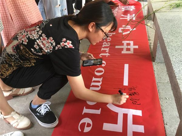 同学们在横幅上签上自己的名字