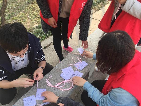 3•12植树节,你们用心栽培树木,我们为绿树增添新意。英语系青年志愿者服务队的粉色丝带飘扬在绿叶之间显得格外美丽!