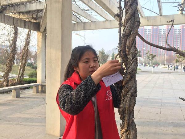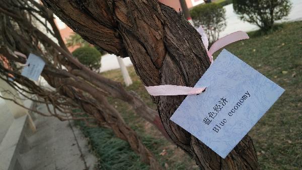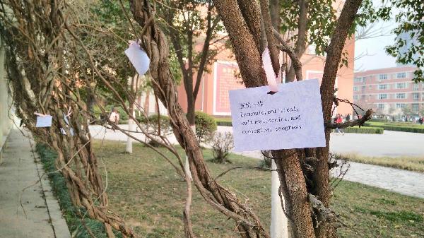 英语系志愿者们摘录《人民日报》中两会热词翻译,精心制作成彩色的小卡片,用粉色的丝带系在学校文化长廊的藤蔓上,让漫步长廊的同学们在放松之余了解、学习两会热词,感受藤蔓的新景色。