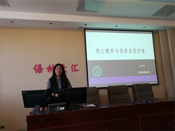 2018年5月2日下午,英语系副教授薛英利作了题名为“死亡教育与丧亲哀伤疗愈”学术报告,英语系全体教师和我校部分师生参加了此次学术交流。该学术报告旨在探究丧亲哀伤辅导或疗愈方案。当下医学发展迈进了人文医学时代,医学人文关怀需尊重个体的生命、尊严、情感和价值,关注个体躯体健康和精神健康。在死亡教育缺失的今天,探索中国文化框架下的死亡教育和丧亲哀伤疗愈显得很必要。马丁·海德格尔提出的向死而生指导个体:死亡是人的存在的一种方式,“在踏实的存在中,个体过着走向死亡的生活”-这种向死而生、向死而存的深刻认识,促使人们更好地把握‘生’,活出‘生’的意义”。生如夏花之绚烂,死如秋叶之静美。死亡只能结束生命,却不能结束关系。西方文化中个体被期望迅速地从哀伤中复原,而东亚国家鼓励丧亲者在亲人去世后继续保留与逝者的情感联结。