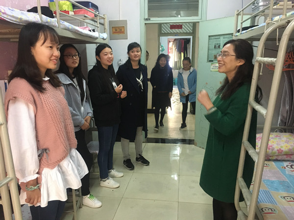 为进一步加强学生宿舍日常安全管理工作,丰富宿舍文化生活,为学生提供和营造一个安全、舒适、便利和有益身心健康发展的学习和生活环境,督促我系学生保持良好的宿舍卫生环境,2017年10月27日中午,英语系主任陈蓁、系党总支副书记陈旭华、副主任薛英利和系党政办、学生科的几位老师及系学生会权益部的同学们对我系学生宿舍安全卫生、寝室风貌等方面进行检查,并走访了辅导员工作室、学生党团活动室等。