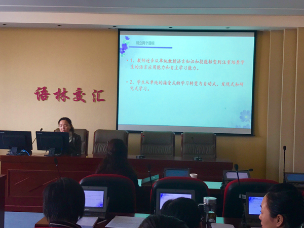 张艳老师汇报了暑期参加成都全国外语教师培训的收获。她重点介绍了“智慧设计,搭建通向智慧学习的桥梁”的新思路,进行课内外一体化教学的改革实践,即把传统的教学模式转变为“以教材、技术、资源、语言活动为支撑”的新型教学模式。教师逐步从单纯教授语言知识和技能转变到注重培养学生的语言应用能力和自主学习能力。学生从单纯的接受式的学习转变为自动式、发现式和研究式学习。并且提醒教师在教学课时日趋减少的情况下,如何做好完成教学任务和保证教学质量的工作。