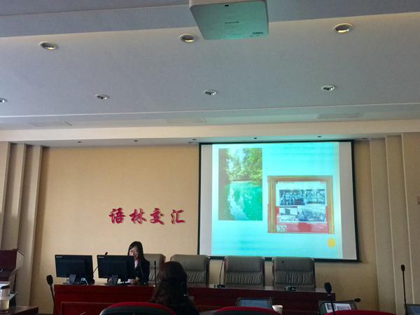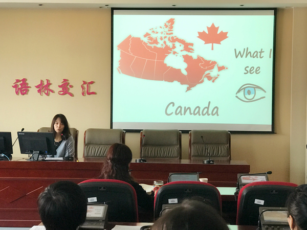首先由宋元源老师汇报了去加拿大访学的经历,介绍了参加TESL (Teaching English as Second Language)即“二语习得”的过程。她从课程设置到教学技巧,从语言学应用到教学法以及评估体系等,详细地介绍了加拿大的教学体系和先进的教学理念,即注重基于能力培养,以学生为主,再现真实生活场景,去完成教学任务。同时分享了她的学习感悟,那就是充分了解学生,要多为学生考虑,运用各种教学手段甚至教师的肢体语言,激发学生的学习热情。