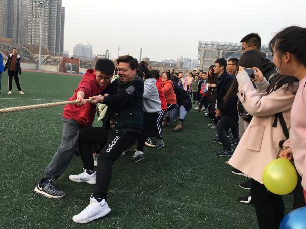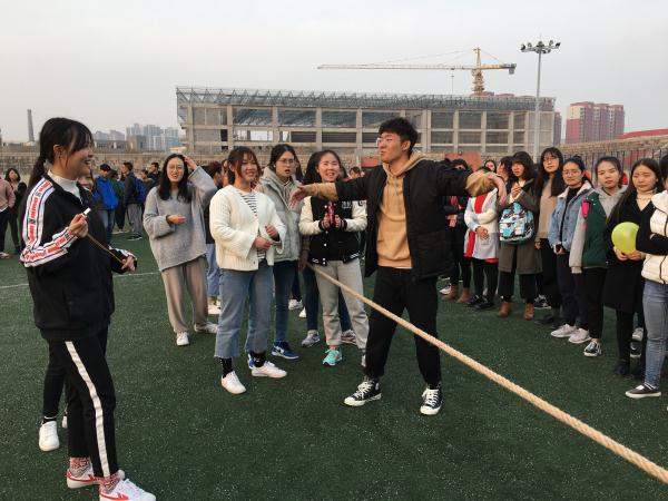 英语系16、17级全体学生共同参与本次活动。活动以“营造团结和谐的校园氛围”为宗旨,采用三种比赛形式。首先进行的是拔河比赛,参赛选手精神饱满,队员之间配合默契,胜负难分的时刻,大家咬紧牙关、努力拼搏,呐喊助威声此起彼伏。随即进行的“心心相印”、“两人三足”的两个项目考验了同学们之间的团结协作能力。在“两人三足”的项目中,系住脚踝红丝带也把大家的心紧紧连在一起。