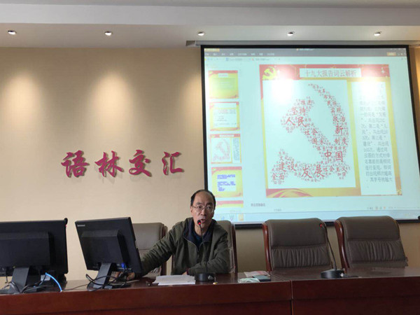 陈旭华以十九大报告新时代、新矛盾、新思想、新目标为切入点,分别阐述了“人民本色,始终是奋斗的前提”、“人民情怀,始终是力量的源泉”、“立德树人,为了人民的利益不懈奋斗”等内容,深入分析了十九大胜利召开对中国发展与社会进步的重要意义。