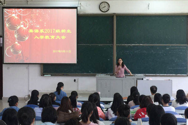 (英语系)2017年9月11日上午,英语系在教学楼教一阶教室举办2017级新生入学教育启动仪式。系主任陈蓁,党总支副书记陈旭华,系副主任薛英利,系教学科科长毛婧,系党政办主任高翔,系学生科副科长李美玥出席了此次会议,会议由英语系教师唐欣雨主持。英语系辅导员老师及2017级全体新生参加会议。
