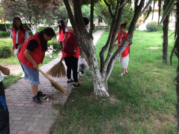 下午两点整,志愿服务队的二十位同学们首先在立行楼前集合,进行了简单分组后便投入到清扫活动之中。一组同学从立行楼前开始打扫,另外几组同学分别对图书馆前、教学楼周边区域和生活区小花园内的环境进行清扫和维护。