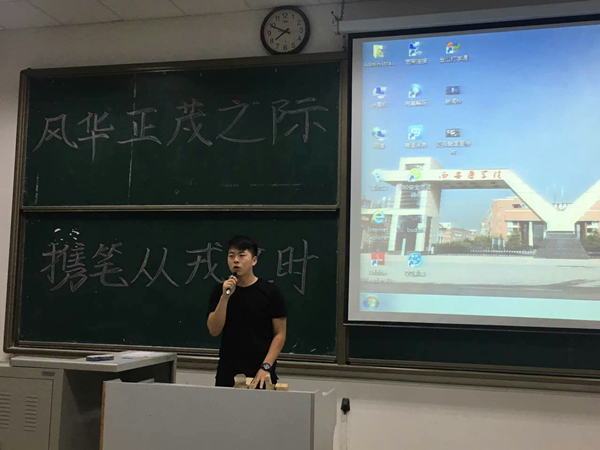 为积极响应国家政策,学校号召,提高同学们对大学生入伍的了解,培养学生的爱国精神,增强大学生国防意识,2017年9月27日晚上19:00英语系举办了以“风华正茂之际,携笔从戎之时”为主题的爱国主义教育活动。