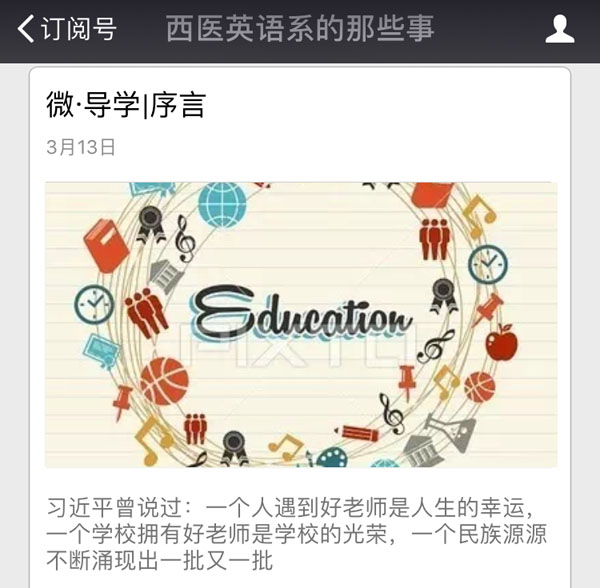 (英语系)为更好落实英语专业本科生导师制,提高英语专业本科生培养质量,促进英语专业学生学习,英语系决定借助微信公众号——“西医英语系的那些事”,开展“导学有法Follow Me”微信导学活动,由导学教师每周向学生推荐优秀读物、经典论文、励志电影、就业引导、毕业论文撰写等内容。