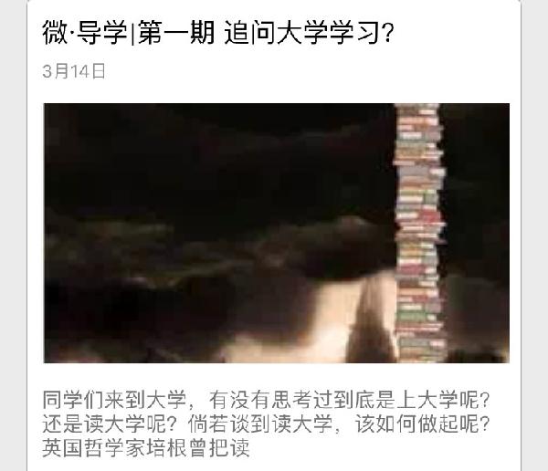 微信导学活动的开展,将本科生导师制进一步融入学生日常生活之中,老师们将自己渊博的学识、丰富的阅历与同学们倾情分享,通过这个微信公众号,同学们可以收获到另一种学习资源。