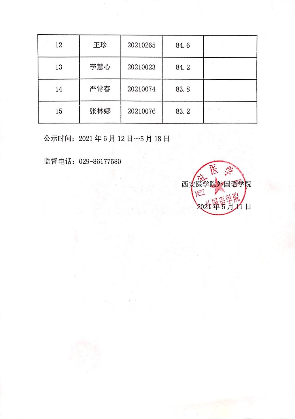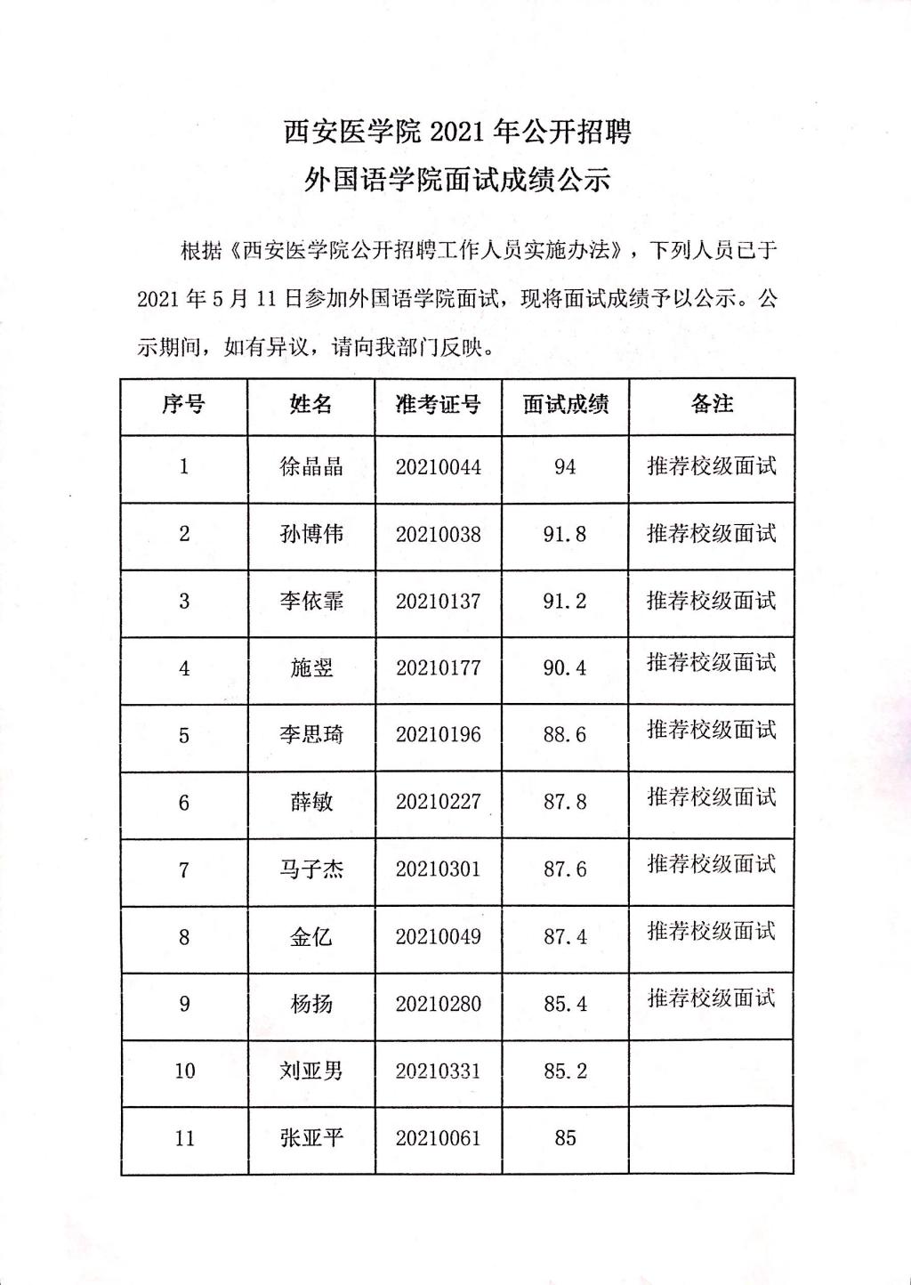 西安医学院2021年公开招聘外国语学院面试成绩公示