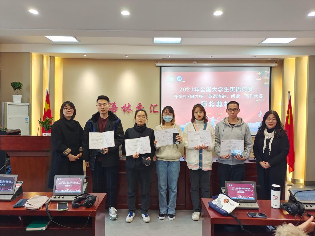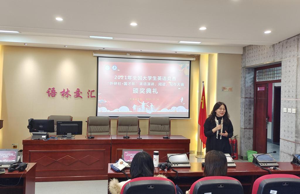 11月16日中午,外国语学院在院学术报告厅举办2021年全国大学生英语竞赛暨“外研社·国才杯”英语演讲、阅读、写作大赛颁奖典礼,出席本次颁奖典礼的有外国语学院院长薛英利、副院长薛婷,以及教研室主任张艳副教授、钱雯副教授和教师代表屈厦沙老师、张蓉老师。