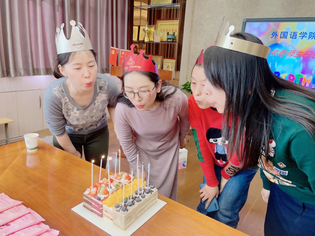 集体生日会上,外国语学院院长薛英利向寿星们表达了真挚的祝福,并为过生日的老师佩戴生日帽,虽是一个小小的举动,却倾注了学院对教职工的亲切关爱。随后寿星们点燃生日蜡烛,在生日歌的旋律中许愿、吹蜡烛、切蛋糕,集体生日会在一片欢乐、温馨中进行。(外国语学院 文/高翔 图/马梓炫 审核/薛英利)