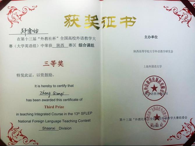 “外教社杯”全国高校教学大赛是我国举办最早、最具影响力的全国性高校外语教学大赛。大赛覆盖全国千余所高校,因其严谨、创新、公正、权威,获得外语界一致赞誉和教育主管部门的高度评价。此项赛事由教育部高等学校外国语言文学类专业教学指导委员会、教育部高等学校大学外语教学指导委员会、陕西省大学外语教学研究会和上海外语教育出版社共同主办,含综合组和视听说两个组别,分设特等奖1名,一等奖2名。