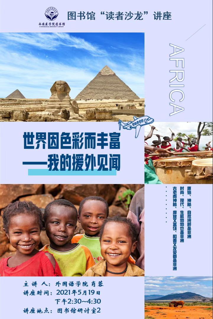 近年来,西安医学院外国语学院多名师生参与援非医疗实践。肖蓉副教授曾于2001-2003年担任中国(陕西)苏丹援外医疗队随队翻译工作,随后自2018年4月至2020年9月担任中国(陕西)第6批和第7批马拉维医疗队随队翻译并完成了历时两年半的援外工作。回国后,面向全校师生3次作题名为“我付出 我感动 我幸福”的援非经历分享交流活动。同时,走进西安市第八中学,分享援外医疗体悟。校内外分享交流活动增进了师生对非洲社会和文化的深度了解。