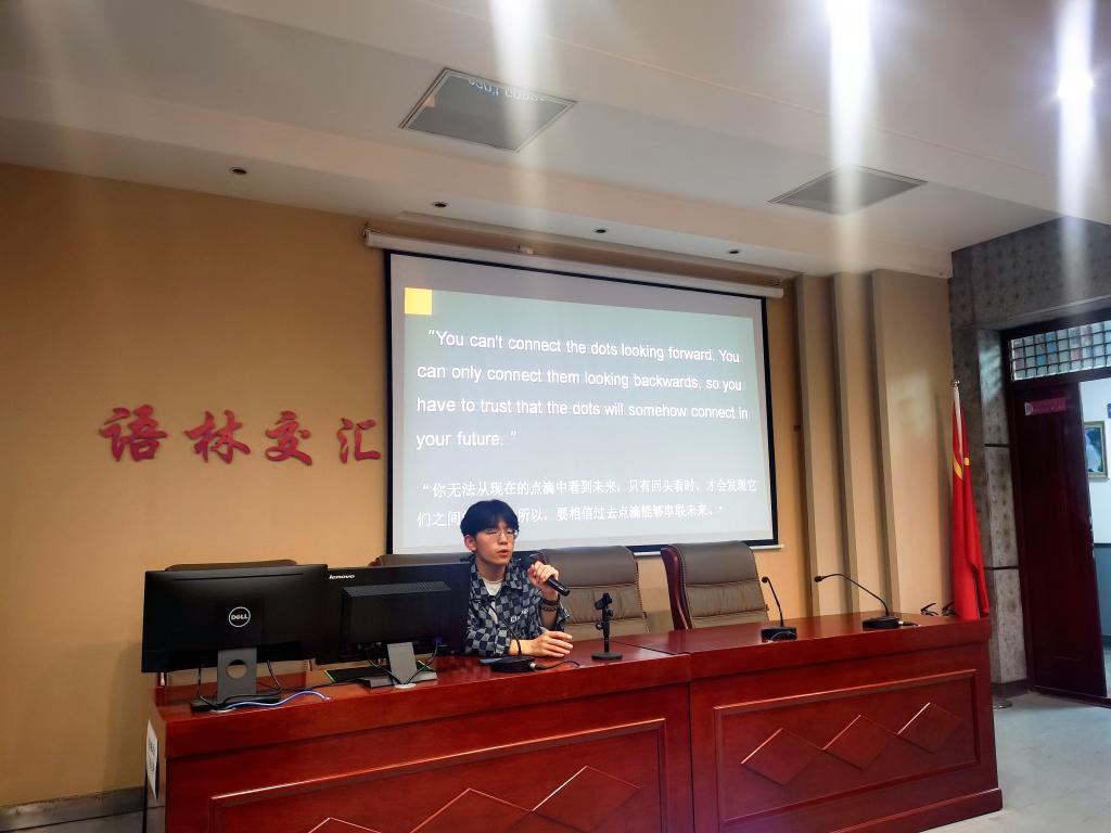 何泽涵分享了湖南师范大学的校园文化,浓厚的学习氛围与人文气息。重点分享了跟听国内知名教授高质量的学术报告的深刻感悟,尤其是中国人民大学外国语学院郭英剑教授“ChatGPT时代的外语专业建设与未来发展”、上海交通大学彭青龙教授“外语学科区域国别学人才培养和科学研究的挑战、机遇与定位”、浙江师范大学胡美馨教授“以中非双向传播促进中国话语国际表达——浙江师范大学为例”、上海大学尚新教授“试论外语学科在国际传播能力建设中的定位、方略及实践探索”等一系列报告,报告深化了自身对所学英语专业的认知。何泽涵最后用“You can't connect the dots looking forward. You can only connect them looking backwards, so you have to trust that the dots will somehow connect in your future.”(“你无法从现在的点滴中看到未来,只有回头看时,才会发现它们之间的关系。所以,要相信过去点滴能够串联未来。”)总结此次研学。激励学弟学妹重视日常学习积累,转变学习方式,坚信读书破万卷。
