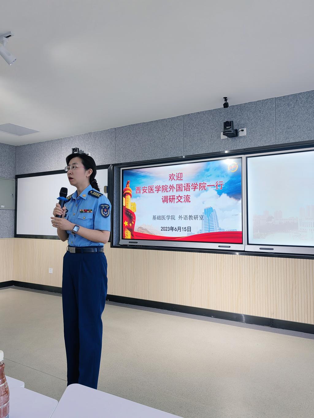 空军军医大学基础医学院外语教研室组织了调研交流会。调研交流会由基础医学院外语教研室主任姜冬蕾主持。基础医学院外语教研室副主任王庆怡简要介绍了空军军医大学师资力量、科研数据、学科竞赛、教学比赛、教材建设成果。