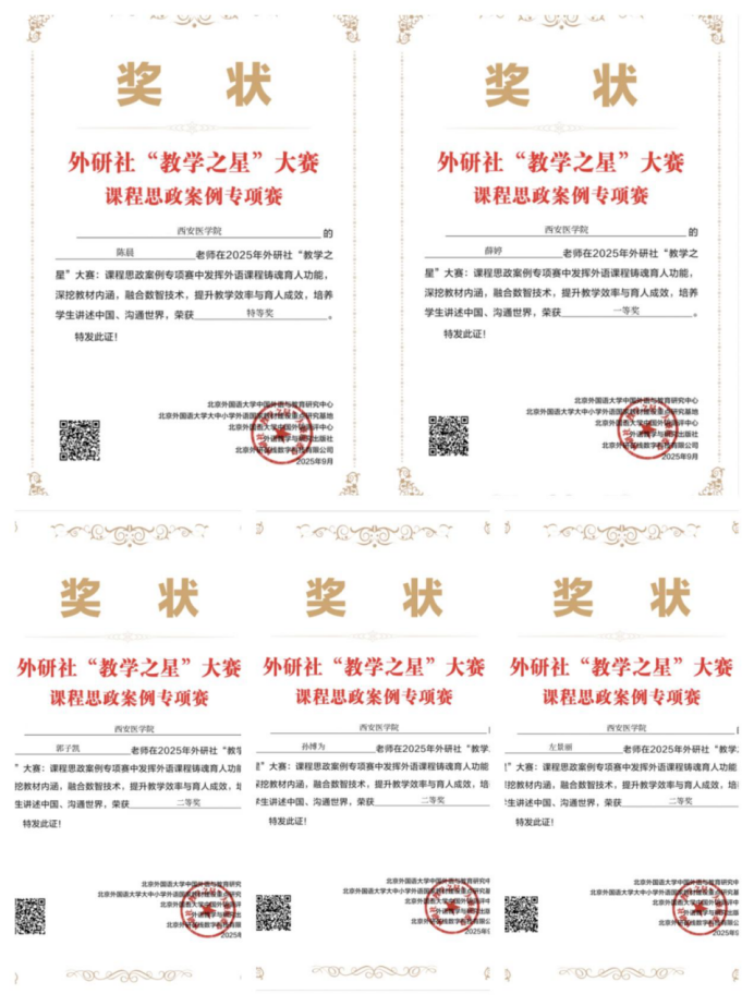 外研社“教学之星”大赛:课程思政案例专项赛旨在搭建沟通交流外语课程思政育人实践的平台,全面提升课程思政建设深入性、创新性与有效性,助力高校服务国家战略、培养堪当民族复兴重任的时代新人。本年度大赛以“外语教材的有效使用:讲述中国,沟通世界”为赛题,设置主赛道和“理解当代中国”赛道。在“理解当代中国”赛道中,陈晨荣获特等奖、薛婷荣获一等奖,郭子凯荣获二等奖;在“主赛道”中孙博为、左景丽荣获二等奖。