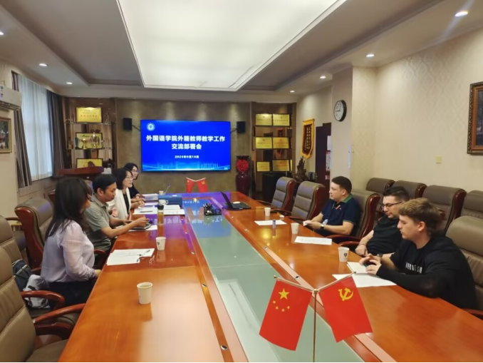 9月16日,外国语学院召开外籍教师教学工作交流部署会议。外国语学院党总支书记刘军林、副院长薛婷、国际合作与交流办公室综合科科长唐臻娜、翻译学骨干教师冯晓霞及三名外籍教师参加会议,会议围绕外籍教师管理、教学安排及教案修订等核心议题展开深入交流,旨在推动外籍教师教学管理规范化,提升教育教学水平。