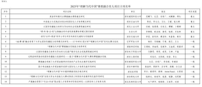 近日,陕西省教育厅办公室正式公布了2025年“理解当代中国”赛教融合育人项目立项名单。我院李乐老师主持的“‘理解当代中国’中外教师赛教双轨反哺式研究”项目成功获批立项。