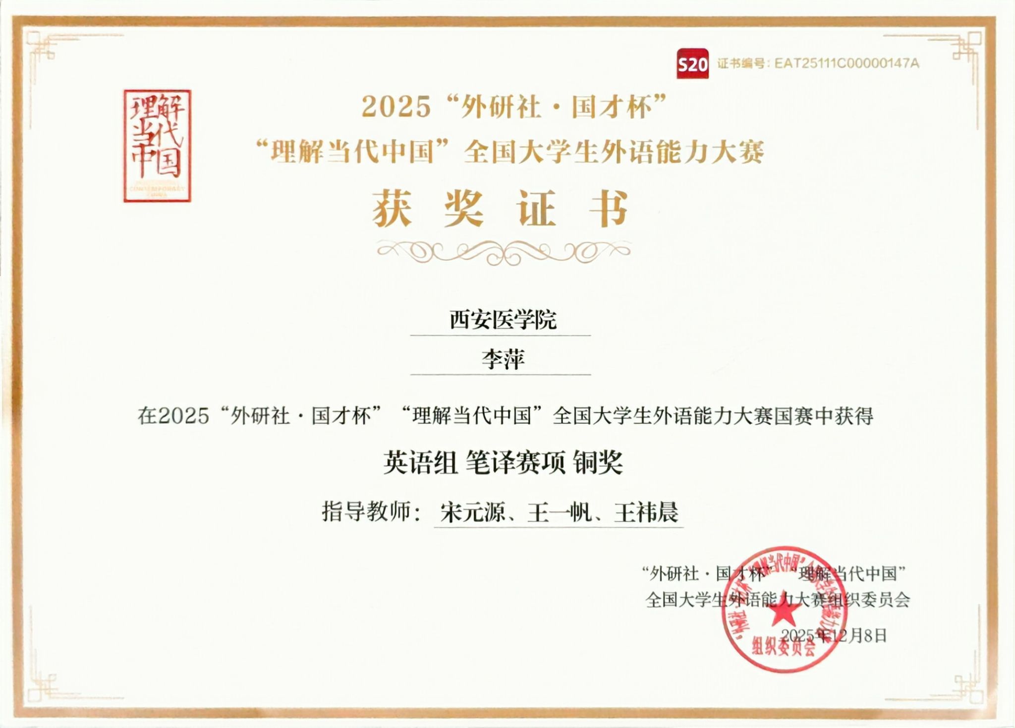 近日,2025“外研社·国才杯”“理解当代中国”全国大学生外语能力大赛全国总决赛在北京落幕,我校外国语学院2023级本科生李萍喜获英语组笔译赛项铜奖。